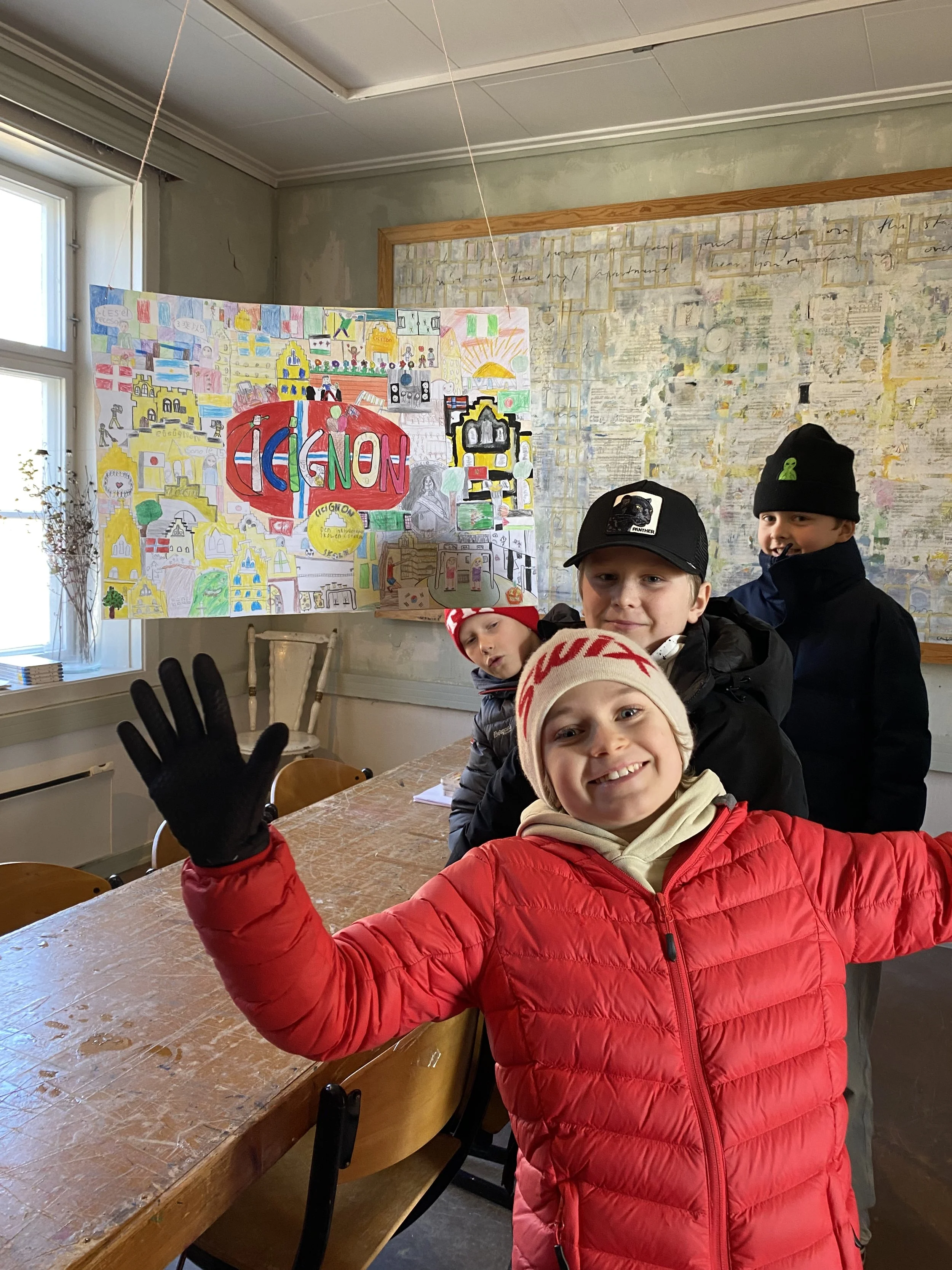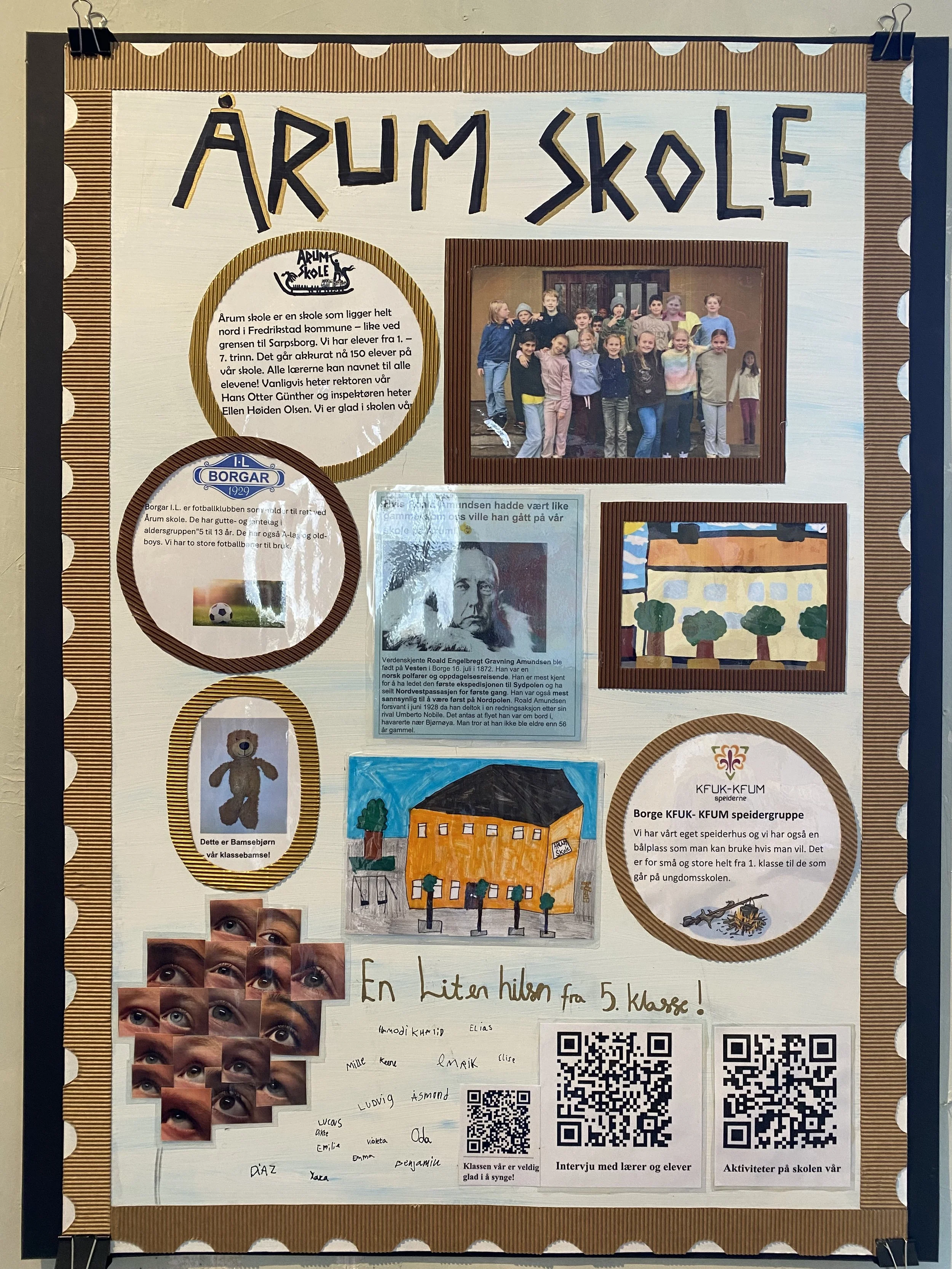 Elevene i klassen jobber sammen. Her kan dere skrive, tegne og feste på bilder som forteller om skolen deres, stedet der dere bor og hva man kan gjøre der.